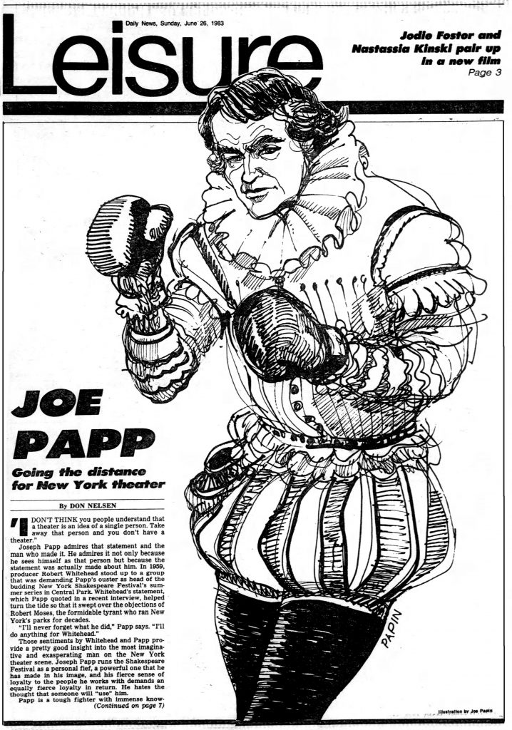 Joseph Papin drew Joseph Papp for the June 26, 1983 Daily News Leisure section which references Joseph Papp’s conflict with Robert Moses: