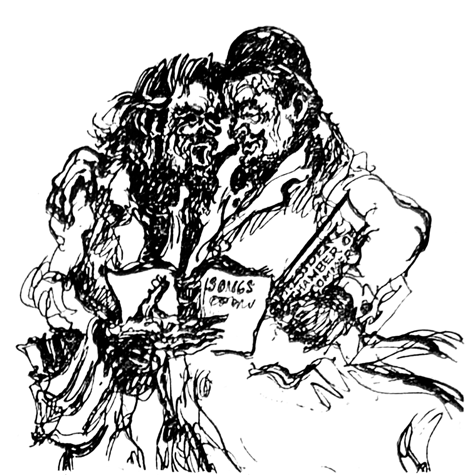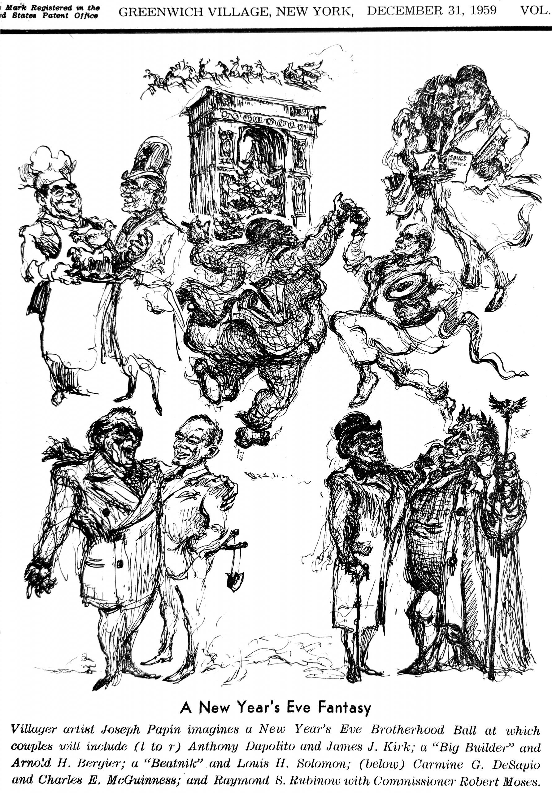 “Villager artist Joseph Papin imagines a New Year’s Eve Brotherhood Ball at which couples will include (l to r) Anthony Dapolito and James J. Kirk; a ‘Big Builder’ and Arnold H. Bergier; a ‘Beatnik’ and Louis H. Solomon; (below) Carmine G. DeSapio and Charles E. McGuinness; and Raymond S. Rubinow with Commissioner Robert Moses.”