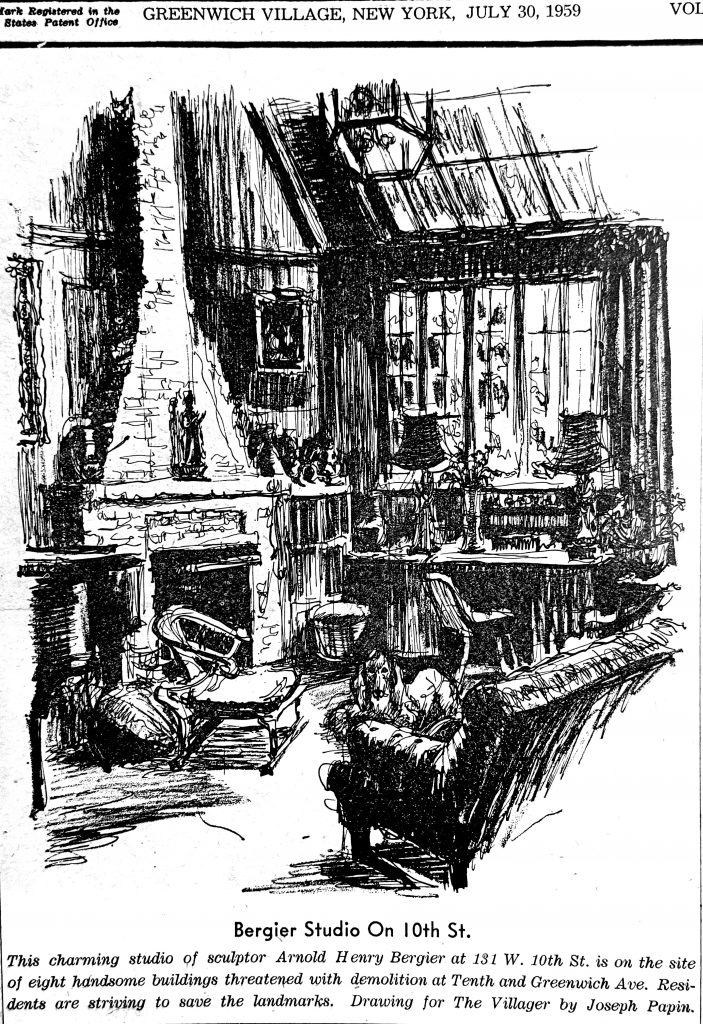 “This charming studio of sculptor Arnold Henry Bergier at 131 W. 10th St. is on the site of eight handsome buildings threatened with demolition at Tenth and Greenwich Ave. Residents are striving to save landmarks. Drawing for The Villager by Joseph Papin.”